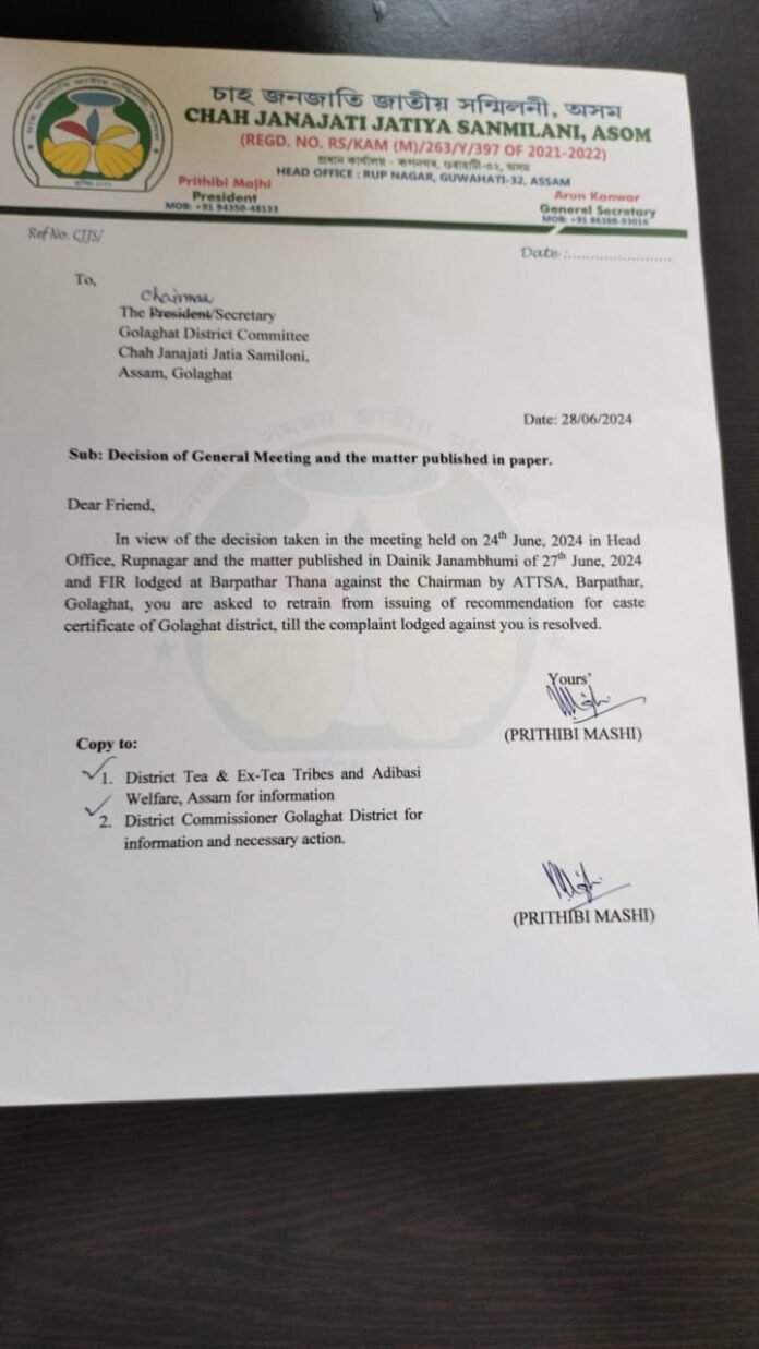 অনা চাহ জনগোষ্ঠীৰ প্ৰাৰ্থীক চাহ জনগোষ্ঠীৰ জাতিগত প্ৰমাণপত্ৰ প্ৰদানৰে গোলাঘাটত বৃহৎ কেলেংকাৰী