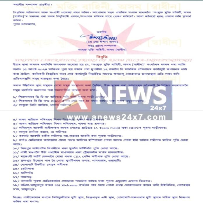 বিবৃতিত উল্লেখ কৰা অনুসৰি, আজি ১৫ আগষ্টৰ দিনটোত পুৱা ৬ বজাৰ পৰা দুপৰীয়া ১২ বজালৈ সামৰিক প্ৰতিবাদৰ কাৰ্যসূচী ৰূপায়ণৰ সময় ধাৰ্য কৰা হৈছিল। কিন্তু কাৰিকৰী বিজুতিৰ বাবে সেই কাৰ্যসূচী নিৰ্ধাৰিত সময়ত ফলপ্ৰসূ নোহোৱাত জনস্বাস্থ্যৰ প্ৰতি লক্ষ্য ৰাখি প্ৰতিবাদস্থলীসমূহ ৰাজহুৱা কৰা হৈছে