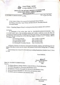 সমগ্ৰ শিক্ষা বিভাগে ৰাজ্যজুৰি প্ৰচলিত অতি শীতল বতৰৰ পৰিপ্ৰেক্ষিতত সময় সলনি কৰা সনান্তৰালকৈ বিশ্বনাথ জিলাৰ ছাত্ৰ-ছাত্ৰীৰ স্বাস্থ্য আৰু সুৰক্ষাৰ প্ৰতি লক্ষ্য ৰাখি বিদ্যালয়সমূহৰ সময় আৰু কৰ্ম সময় সলনি কৰাৰ সিদ্ধান্ত লোৱা হৈছে ।