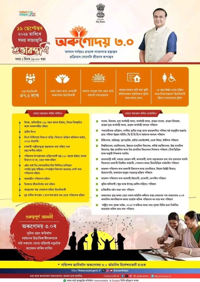 ডিজিটেল ডেস্ক, ১৯ছেপ্তেম্বৰ: অসমৰ মুখ্যমন্ত্ৰী হিমন্ত বিশ্ব শৰ্মাই ১৯ ছেপ্টেম্বৰত ৰাজ্যখনৰ অৰুণোদয় আঁচনিৰ ৰাষ্ট্ৰীয় প্ৰভাৱৰ ওপৰত আলোকপাত কৰে। ২০২০ চনত আৰম্ভ হোৱা এই আঁচনিখনে অসমৰ মহিলাসকলক যথেষ্ট সুবিধা প্ৰদান কৰাই নহয়, সমগ্ৰ ভাৰতবৰ্ষতে অনুৰূপ পদক্ষেপৰ বাবেও অনুপ্ৰেৰণা যোগাইছে।