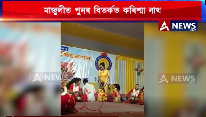 নিশা মাজুলীৰ সোনাৰীআটী নৱজ্যোতি কৃষ্টি সংঘত সদৌ অসম নাথ যোগী যুৱ পৰিষদৰ দ্বি-বাৰ্ষিক মাজুলী অধিৱেশনৰ সাংস্কৃতিক অনুষ্ঠানত নাগাৰা নাম পৰিৱেশনৰ বাবে আমন্ত্ৰিত শিল্পী কৰিশ্মা নাথৰ সৈতে উদ্যোক্তা সকলে জাতীয় সংগীত ভুলকৈ পৰিৱেশন কৰাৰ লগতে কৰিশ্মাই নাম পৰিৱেশনৰ মাজতে কান্ধৰ পৰা অসমীয়াৰ স্বাভিমান গামোচা মজিয়াত থৈ ভৰিৰে আঁতৰাই দিয়া গৰ্হিত কাৰ্যই সমগ্ৰ মাজুলীতে চৰ্চিত হৈছে।