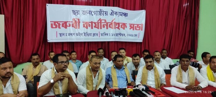 ছয় জনগোষ্ঠীয় ঐক্য মঞ্চই শুক্ৰবাবে মৰাণত এক জৰুৰী কাৰ্যনিৰ্বাহক সভা আয়োজন কৰি জনজাতিকৰণৰ দাবীৰে এলানী প্ৰতিবাদী কাৰ্যসূচী গ্ৰহণ কৰে ৷ ছয় জনগোষ্ঠীয় ঐক্য মঞ্চই শুক্ৰবাৰে ঘোষণা কৰা আন্দোলনৰ কাৰ্যসূচী সমূহ –