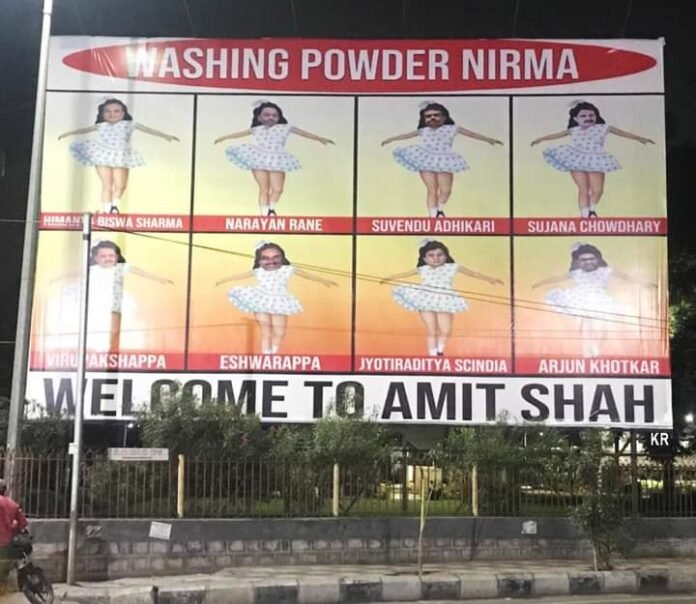 আনহাতে ভাৰত ৰাষ্ট্ৰ সমিতি চমুকৈ BRSয়ে চহৰখনৰ অলিয়ে-গলিয়ে আঁৰিছে এনে পোষ্টাৰ সমূহ । পোষ্টাৰখনত আছে মহাৰাষ্ট্ৰৰ নাৰায়ণ ৰাণে, মধ্যপ্ৰদেশৰ জ্যোতিৰাদিত্য সিন্ধিয়া আৰু পশ্চিমবংগৰ শুভেন্দু অধিকাৰী। দিল্লীৰ সুৰা কেলেংকাৰিৰ গোচৰত ৰাজ্যখনৰ মুখ্যমন্ত্ৰী কে চন্দ্ৰশেখৰ ৰাওৰ কন্যা কে কবিতাক ই ডি য়ে চমন জাৰি কৰাৰ প্ৰতিবাদত BRSয়ে হায়দৰাবাদৰ অলিয়ে-গলিয়ে এনেধৰণৰ ৱাশ্বিং পাউদাৰ শীৰ্ষক পোষ্টাৰ আঁৰিছে এতিয়া ।
