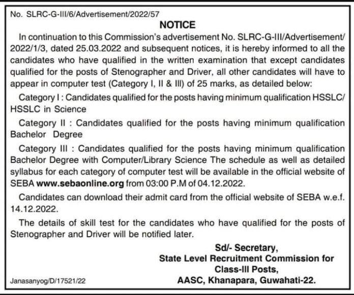 আনুষ্ঠানিক ঘোষণা অনুসৰি ষ্টেন’গ্ৰাফাৰ আৰু ড্ৰাইভাৰ পদৰ আবেদনকাৰীৰ বাহিৰে তৃতীয় শ্ৰেণীৰ লিখিত পৰীক্ষাত উত্তীৰ্ণ হোৱা সকলো পৰীক্ষাৰ্থীয়ে কম্পিউটাৰ পৰীক্ষা দিব লাগিব।