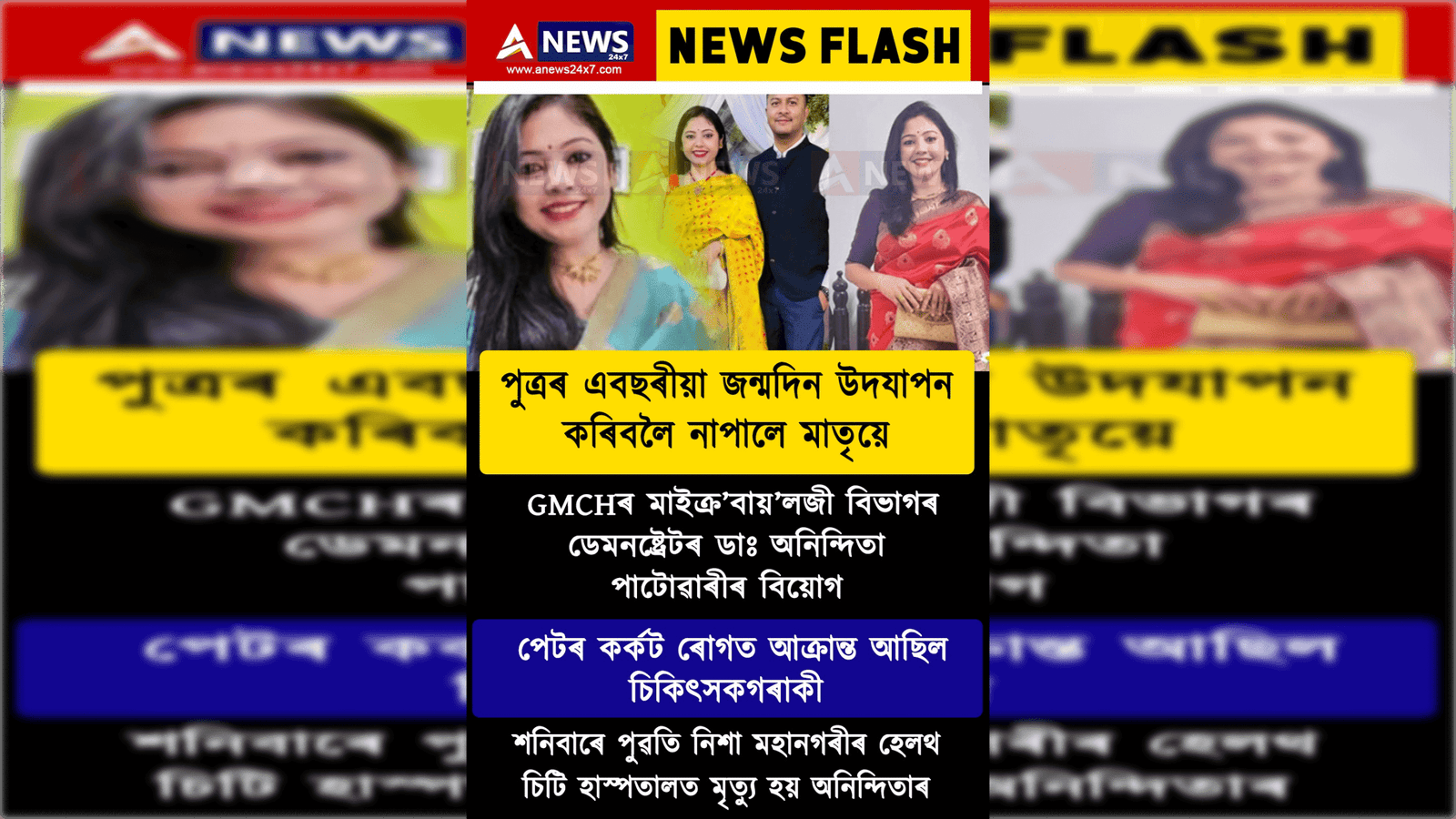 GMCHৰ চিকিৎসক ডাঃ অনিন্দিতা পাটোৱাৰীৰ মৃত্যুত পৰিছে শোকৰ ছাঁ। এবছৰীয়া পুত্ৰৰ প্ৰথমটো জন্মদিনতে মাতৃ বিয়োগৰ এই ঘটনাই মৰ্মাহত কৰিছে পৰিয়ালৰ লগতে আত্মীয়-স্বজনক। ডাঃ অনিন্দিতা পাটোৱাৰীৰ একমাত্ৰ পুত্ৰ পোহৰৰ জন্মদিনটোতেই নিয়তিয়ে কাঢ়ি নিলে মাতৃক